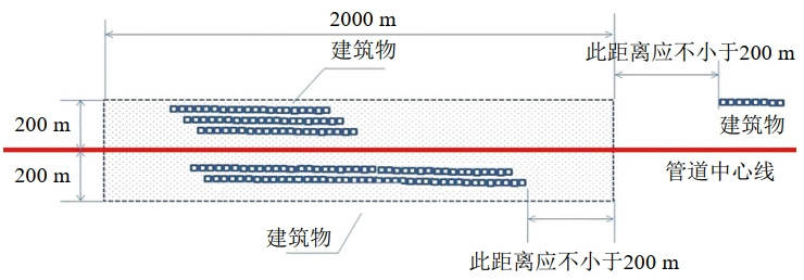 畫一個400 m×2000 m矩形框,在管道中心線沿軸向任意移動,矩形框的兩條400 m短邊距離框內(nèi)外最近建筑物不應(yīng)小于200 m,統(tǒng)計框內(nèi)的住戶數(shù)量,兩端間管道則為高后果區(qū),滿足規(guī)范規(guī)定的哪個條件就劃為哪個等級,簡單易操作(圖 1)。