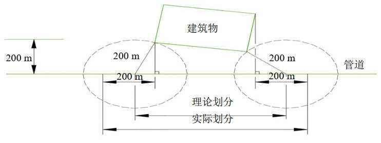居民類構(gòu)建筑物具體確定高后果區(qū)邊界時,按照規(guī)范要求,應(yīng)在管道中心線上畫一個200 m半徑的圓,當(dāng)圓弧與構(gòu)建筑物相接時,圓心距為高后果區(qū)的長度,如圖 2中理論劃分。這樣的識別方法嚴(yán)謹(jǐn),但實際操作難度很大,需將管道路由、構(gòu)建筑物和兩者相對關(guān)系嚴(yán)格按比例繪圖,再用上述辦法畫圓,按比例推算圓心位置,確定高后果區(qū)長度。在建設(shè)期識別時有圖紙可依托,基本可實現(xiàn),但在運行期當(dāng)構(gòu)建筑物與原設(shè)計圖紙發(fā)生變化后,生產(chǎn)運行單位需要重新調(diào)繪管道周邊信息,按照比例繪制圖紙,精度要求高,難度大,不易實現(xiàn)。