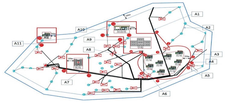 油田集輸油管道大部分呈現(xiàn)為支狀、網(wǎng)狀結(jié)構(gòu),高后果區(qū)識別難度較大,通過實踐總結(jié),形成了符合油氣田特點的區(qū)域識別法(圖 4)。根據(jù)管網(wǎng)年代、環(huán)境、介質(zhì)、管材等主要風(fēng)險因素,以平滑曲線連接邊界,將邊界線以平行趨勢向外延伸200 m,以延伸后的邊界線包含區(qū)域作為一個識別單位,統(tǒng)計管網(wǎng)單元內(nèi)的特定場所、易燃易爆場所、人口密集區(qū)及該場所200 m范圍內(nèi)包含的管道或管段,此管道或管段即為高后果區(qū)管道。