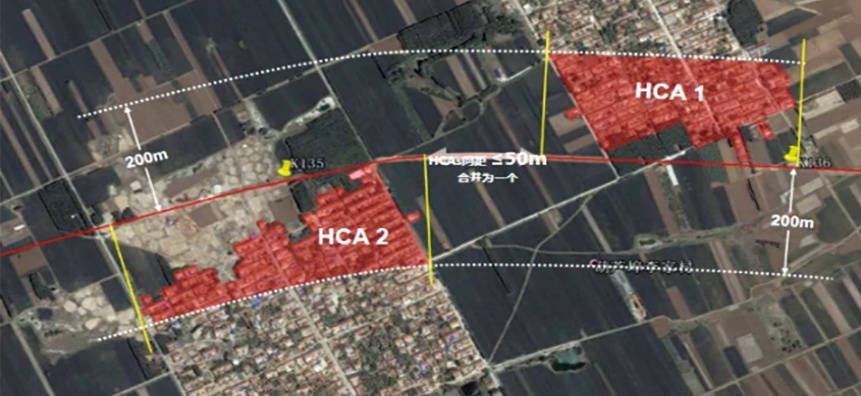 為了提高管理效率、降低管理難度和成本,將間隔小于50 m的同類高后果區(qū)合并為一個高后果區(qū)管理(圖 5)。運行管理單位要采取管理措施或技術(shù)措施,減小高后果區(qū)管道泄漏的風(fēng)險,比如提高巡線頻次,加裝視頻監(jiān)控設(shè)備等。