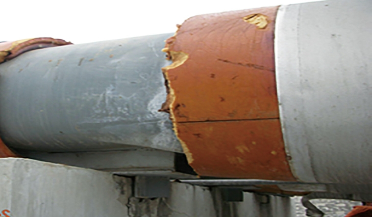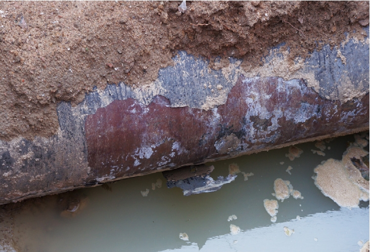 (1)管道防腐層破損。對事故管道開挖發(fā)現(xiàn)瀝青玻璃布防腐層破損、脫落嚴重,管道外壁大面積直接暴露在自然環(huán)境中(圖 2)。在東黃復(fù)線管道建設(shè)期,尚未普及三層PE管道外防腐技術(shù),瀝青玻璃布防腐效果不佳。
