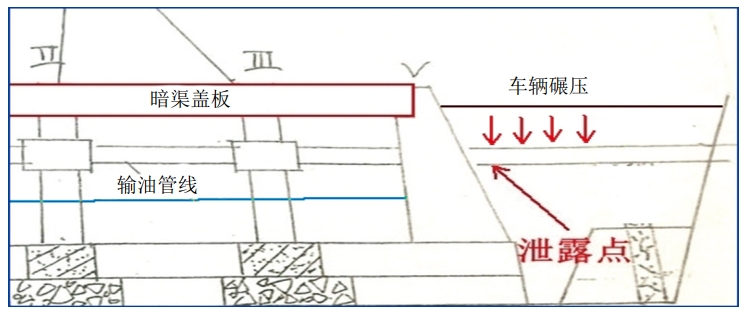 排水渠的建設(shè)在管道之后,由早期的明渠后來加蓋成為暗渠。排水渠在秦皇島路與齋堂島街的“丁”字路口處建設(shè)了橋涵,管道沿秦皇島路在橋涵蓋板下穿過水渠。根據(jù)施工說明,在路口開挖寬度為56 m、中部深度5.3 m的橋涵基坑,橋涵建成后填土掩埋橋涵外側(cè)管道。秦皇島路的建設(shè)也在管道之后,道路與管道相同路由,管道大部分在道路的隔離帶下方,但是路口處的管道不能避免車輛碾壓,尤其是在秦皇島路建設(shè)期間管道上方土層薄、施工車輛重對管道的損傷難以避免。在當年手繪的排水渠橋涵施工圖上后來又標注了暗渠蓋板、車輛碾壓和泄漏點等信息(圖 3)。