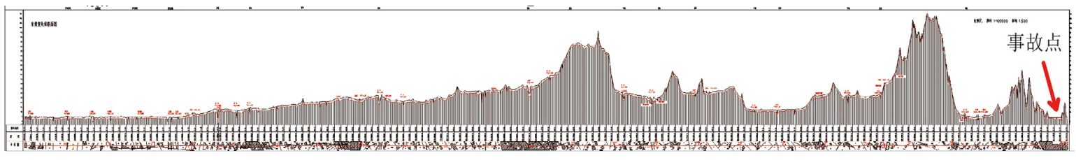 原因之三:壓力高、管壁薄。東黃復(fù)線于1986年7月建成投運,1991年9月通過竣工驗收[1,2]。該管道是我國首條采用大站距、變壁厚、密閉輸送工藝設(shè)計的原油管道[3]。管道原設(shè)計輸油方向是從東營到黃島,設(shè)東營首站、壽光熱泵站、丈嶺熱泵站、黃島末站,管道采用日本進口的API5LX-60鋼管,管徑Ф711.2 mm,壁厚分別為8.74 mm、7.92 mm和7.14 mm三個級別,根據(jù)管道沿線壓力分布選擇管道壁厚,結(jié)果是出站端壁厚大、進站端壁厚小,7.14 mm壁厚管道占總管長的54.4%。1998年10月,管道改為從黃島向東營方向輸送進口原油,黃島油庫變?yōu)槭渍尽|營首站變成末站,停用了加熱爐[4],中間站變?yōu)椴剌斢驼尽酃廨斢驼尽墓艿揽v斷面圖上(圖 4)可見事故點處海拔高度最低,緊鄰首站出站端,該處管內(nèi)的壓力最高,而此處原設(shè)計是末站進站端,管道壁厚最薄。由于壁厚的原因,管道反向輸送改造后,泵站最高出站壓力由原來的6.57 MPa降到4.67 MPa,輸油量由2000萬噸/年下降到1000萬噸/年。然而反輸改造后事故點處管內(nèi)壓力較改造前增加了幾倍。