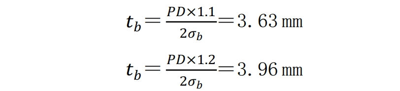 實(shí)際上,管道屈服以后管徑不斷增大。假設(shè)按管道10%和20%延伸率分別進(jìn)行計(jì)算,則管道爆裂的剩余壁厚分別為: