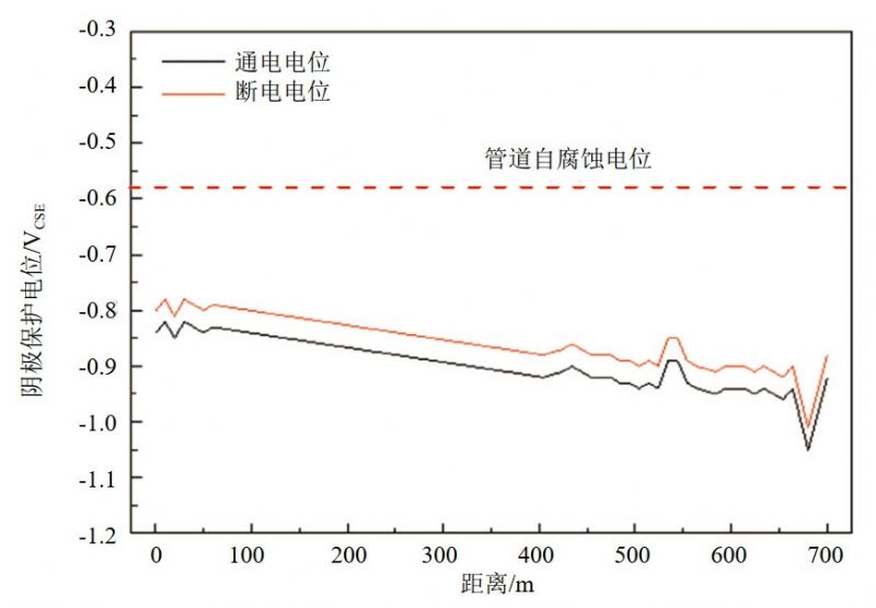 對(duì)事故點(diǎn)西側(cè)殘留管段以西700 m范圍內(nèi)管地通電電位、斷電電位進(jìn)行測(cè)量,測(cè)試間距為10 m。測(cè)量結(jié)果表明該管段通電電位﹣0.83 VCSE~ ﹣1.05 VCSE,斷電電位﹣0.78 VCSE~﹣1.01 VCSE,如圖 4所示。此外,現(xiàn)場(chǎng)檢測(cè)該區(qū)域內(nèi)未施加陰保管道及試片的自然電位為﹣0.48 VCSE~﹣0.63 VCSE。