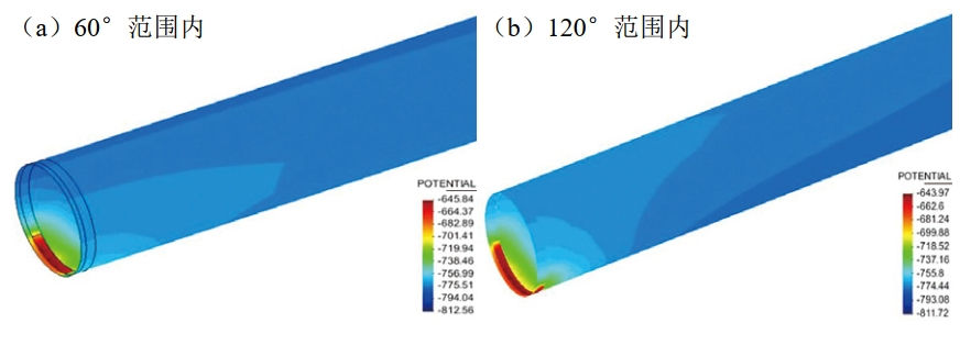 當(dāng)防腐層破損處位于墻體內(nèi)側(cè)30 mm~90 mm,分別處于管道下方60°和120°時(shí)管道外表面電位分布如圖 6所示。