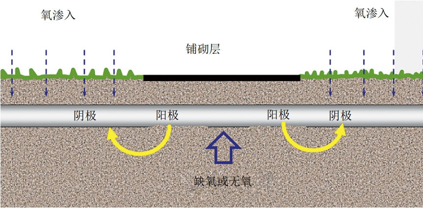 三是氧濃差電池導(dǎo)致管道距離墻體表面1 m之內(nèi)腐蝕嚴(yán)重。管體穿越墻體界面靠近排污暗渠側(cè)氧含量較高,靠近墻體側(cè)氧含量較低,會(huì)在局部形成氧濃差腐蝕電池,加速缺氧位置處的腐蝕,從而導(dǎo)致墻體內(nèi)側(cè)1 m范圍內(nèi)局部腐蝕嚴(yán)重。這個(gè)類似于穿越路面的管道由于氧濃差電池導(dǎo)致管道腐蝕,如圖 8所示。