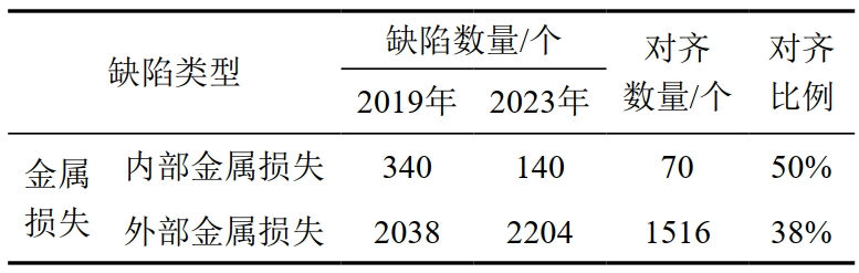 與附件特征對齊比例相比,本體缺陷對齊比例要偏低,主要原因?yàn)椴煌瑑?nèi)檢測承包商對缺陷的量化識別差異。針對未匹配的金屬損失分析,某缺陷2019年檢測被識別為焊縫異常,2023年識別為金屬損失,導(dǎo)致列表無法匹配(圖 3)。