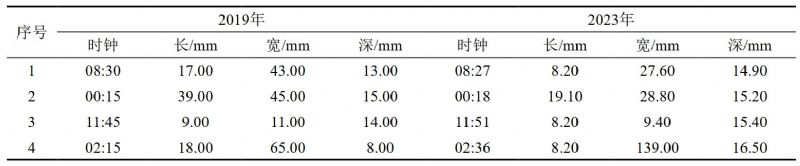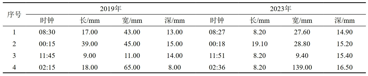 為了分析不同內(nèi)檢測商對缺陷尺寸的量化差異,本文選取了4處能夠匹配的缺陷進(jìn)行了數(shù)據(jù)對比(表 3)。分析可知,兩次內(nèi)檢測匹配缺陷時鐘方位之間的差異均較小。由于檢測器閾值及量化模型差異的原因,缺陷長度、寬度及深度均存在一定差異,單純通過缺陷列表數(shù)據(jù)并不能確定缺陷實(shí)際增長情況。在數(shù)據(jù)對比時,可以通過列表觀察缺陷變化的趨勢,并針對有較大變化的缺陷進(jìn)一步分析,提高比對效率。