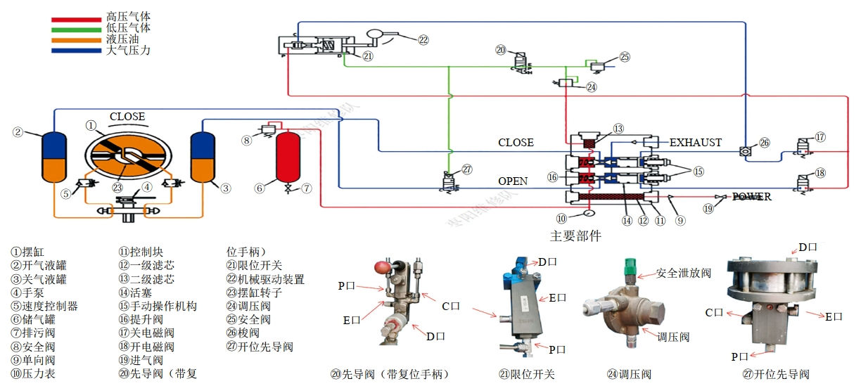 在ESD觸發(fā)時,帶紅色手柄的復(fù)位先導(dǎo)閥20關(guān)閉,C口和E口導(dǎo)通,與開位先導(dǎo)閥27以及限位開關(guān)21連接的先導(dǎo)氣從E口泄放掉,開位先導(dǎo)閥27在失去先導(dǎo)氣的情況下,P口和C口斷開,鎖定開閥氣路。限位開關(guān)21在缺失先導(dǎo)氣的情況下,閥芯向右移動,P口與C口導(dǎo)通,紅色高壓氣體經(jīng)過梭閥26進入提升閥組件,高壓氣體推動提升閥活塞向左移動,錐形密封打開,高壓氣體進入關(guān)氣液罐,推動液壓油流向開液壓罐,擺缸轉(zhuǎn)子在液壓油的驅(qū)動下帶動球閥閥桿執(zhí)行關(guān)閥操作。當(dāng)閥門關(guān)到位后,擺缸上的機械驅(qū)動裝置頂住限位開關(guān)22,利用機械力的方式使P口和C口斷開,關(guān)閥結(jié)束。