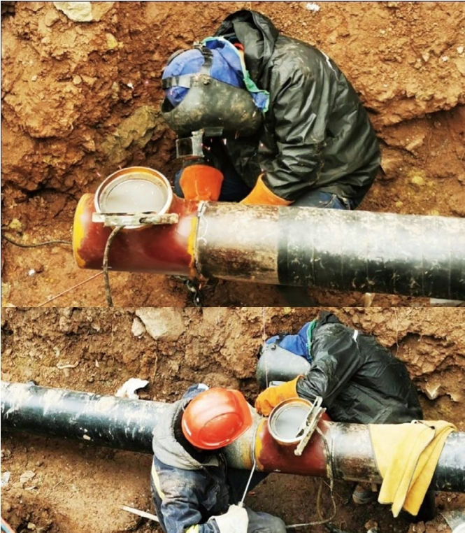動(dòng)火連頭一般采用氬電聯(lián)焊工藝,可通過(guò)三通法蘭端觀察連頭口根焊質(zhì)量。當(dāng)完成舊管線與三通連頭口后,組對(duì)新管線與三通對(duì)接口。若新管線一端明顯出現(xiàn)過(guò)堂風(fēng)、積液及含氧量不達(dá)標(biāo)等情況時(shí),仍可通過(guò)三通法蘭端放置氮?dú)飧綦x氣囊。