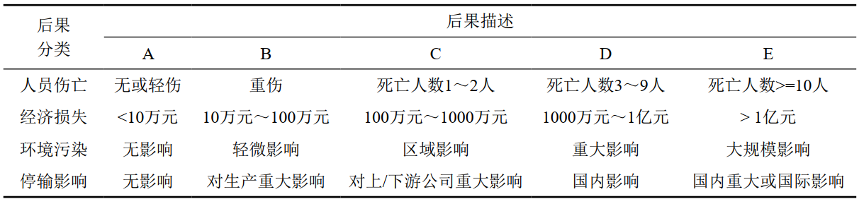 目前主要通過(guò)管道風(fēng)險(xiǎn)評(píng)價(jià)方法來(lái)進(jìn)行管道安全風(fēng)險(xiǎn)等級(jí)劃分。常用的評(píng)價(jià)方法有定性的風(fēng)險(xiǎn)矩陣法、半定量的評(píng)分法和定量評(píng)價(jià)法。其中風(fēng)險(xiǎn)矩陣法應(yīng)用最為廣泛,可以快速實(shí)現(xiàn)風(fēng)險(xiǎn)等級(jí)劃分,確定問(wèn)題嚴(yán)重程度,從而采取針對(duì)性管控措施。