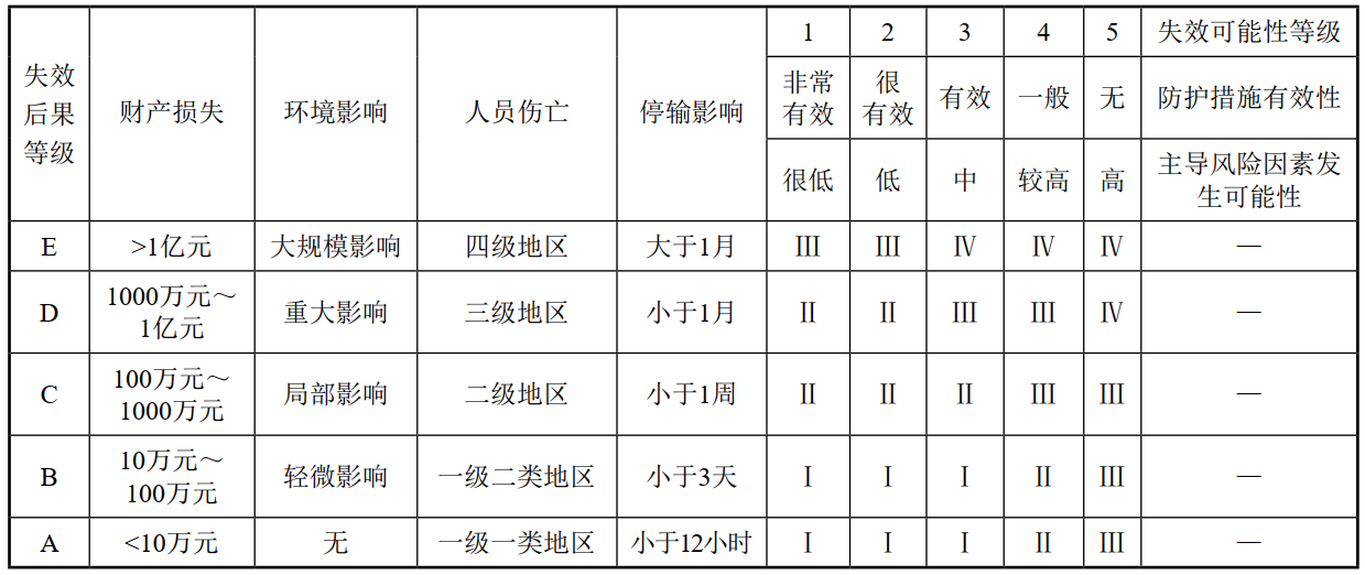 改進(jìn)要點(diǎn)包括:①采用地區(qū)等級(jí)劃分替代失效后果中人員傷亡人數(shù)的分級(jí)方法;②失效可能性分級(jí)中,增加了防護(hù)措施有效性等級(jí)劃分,如果風(fēng)險(xiǎn)點(diǎn)采取了針對(duì)性的防護(hù)措施,最終的失效可能性分級(jí)以主導(dǎo)風(fēng)險(xiǎn)因素發(fā)生可能性、防護(hù)措施有效性確定的等級(jí)中較高者為最終失效可能性等級(jí);③失效可能性分級(jí)中,明確指出應(yīng)以主導(dǎo)風(fēng)險(xiǎn)因素來(lái)劃分等級(jí)。