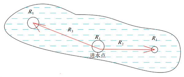 如圖 4所示,假設(shè)防腐層破損點(diǎn)不連續(xù),且各破損點(diǎn)處于進(jìn)水點(diǎn)左右兩側(cè),陰保電流進(jìn)入保溫層結(jié)構(gòu)后分三個(gè)方向(R1、R2、R3)流動(dòng)。假定三個(gè)破損點(diǎn)的直徑均為1.13 cm,水的平均厚度為1 mm、寬度1 cm,R2延伸長(zhǎng)度為10 cm,R3延伸長(zhǎng)度為20 cm,按式(1)(2)計(jì)算三個(gè)通路的電阻。