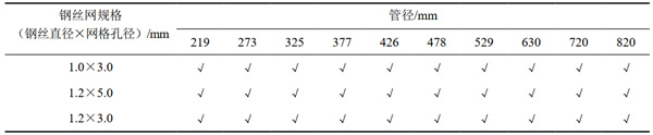(3)不同管徑管道內(nèi)置金屬網(wǎng)規(guī)格選擇。按30年使用壽命計(jì),表 1為不同管徑管道內(nèi)置金屬網(wǎng)選用鋼絲網(wǎng)規(guī)格推薦表。
