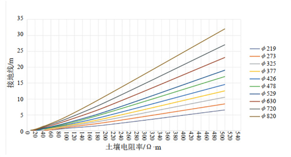 圖 6 不同土壤電阻率下各管徑管道所需引流接地線長(zhǎng)度對(duì)照?qǐng)D