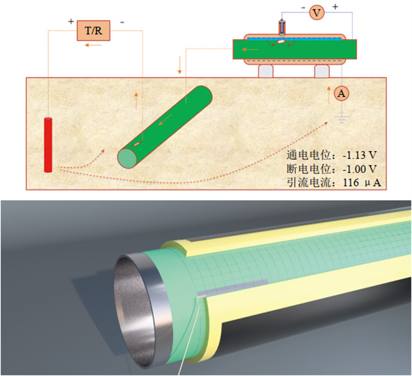 埋地油氣長(zhǎng)輸管道的腐蝕控制主要采用防腐層和陰極保護(hù)相結(jié)合的手段。對(duì)于熱油輸送管道,必須要有隔熱保溫層。預(yù)制保溫層的埋地鋼質(zhì)管道,防腐層處于保溫層底層,保溫結(jié)構(gòu)會(huì)屏蔽陰極保護(hù)電流,造成陰極保護(hù)無(wú)效或部分無(wú)效,防腐層外檢測(cè)效果差,僅能通過(guò)內(nèi)檢測(cè)發(fā)現(xiàn)管道腐蝕情況,使腐蝕控制和腐蝕監(jiān)控工作受到影響,嚴(yán)重威脅管道安全運(yùn)營(yíng)。目前,國(guó)內(nèi)外尚無(wú)有效的方法解決管道保溫與陰極保護(hù)的沖突。本次研究旨在用較低成本改造管道保溫結(jié)構(gòu),解決陰極保護(hù)屏蔽問(wèn)題,使具有保溫層的埋地管道處于有效陰極保護(hù)狀態(tài),減緩管道腐蝕速率,提高防腐層破損點(diǎn)的可檢性。