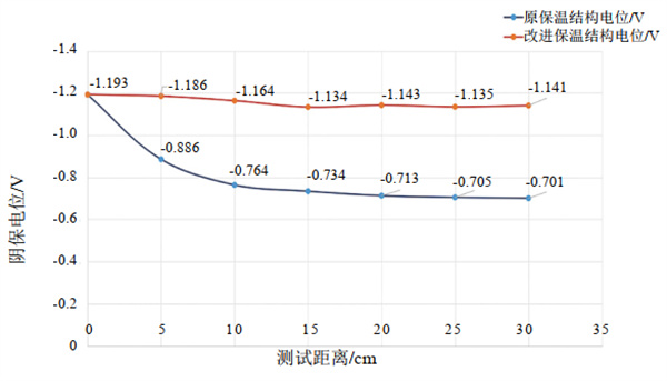 圖 8 保溫結(jié)構(gòu)改進(jìn)前后管道陰保電位數(shù)據(jù)對(duì)比圖