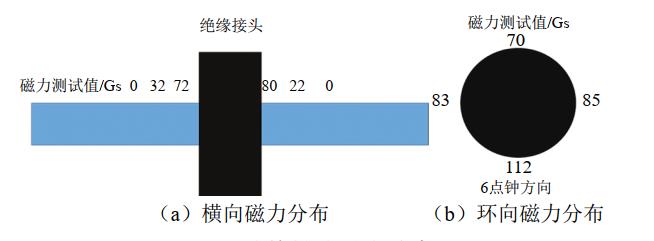 利用磁力計(jì)檢測(cè),結(jié)果表明絕緣接頭附近管道磁力分布規(guī)律:越靠近絕緣接頭、越靠近底部6點(diǎn)鐘方向,磁力越大(圖 2)。該磁力分布特性,使油品中鐵磁性物質(zhì)在絕緣接頭底部堆積。導(dǎo)致站內(nèi)、站外電導(dǎo)通,引起絕緣接頭失效。當(dāng)管道油品持續(xù)流動(dòng)將堆積鐵屑帶走后,絕緣接頭恢復(fù)性能。表現(xiàn)為絕緣接頭間續(xù)通斷現(xiàn)象。