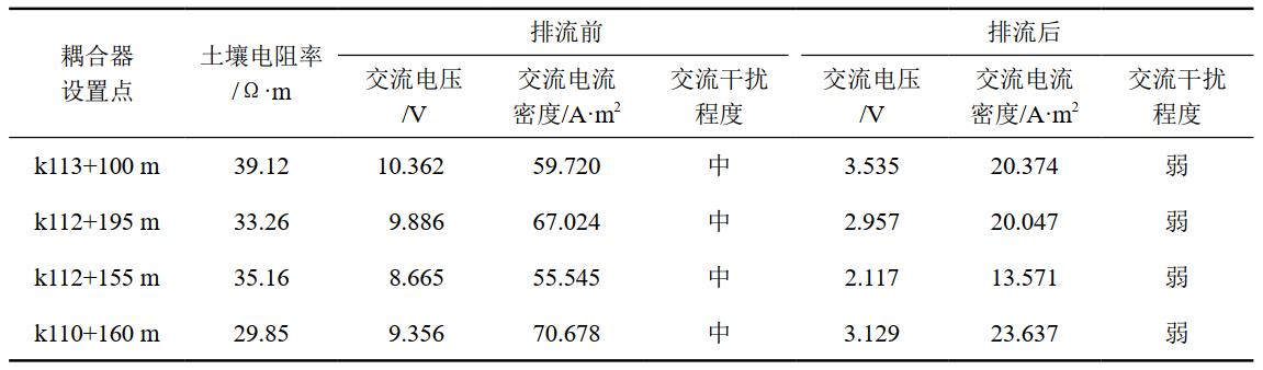 (1)管道穿越京滬高鐵等電氣化鐵路7處。與直供式電氣化鐵路交叉地段,應(yīng)至少在交叉段的其中一側(cè)設(shè)置一處排流防護點。設(shè)計施工階段各穿越點一側(cè)設(shè)置了耦合器排流,用以排出流入管道的雜散電流。以京滬高鐵穿越為例,排流效果見表 1。結(jié)果表明,最大交流電流密度小于標準規(guī)定的30 A/m2,交流干擾程度判斷為弱。