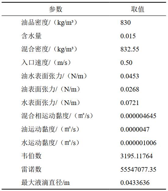 混合相入口速度依據(jù)油品經(jīng)濟(jì)流速確定為0.5 m/s,根據(jù)該附錄A2.1所列Brauner模型, 可以得到0#柴油最大液滴直徑約為0.0434 m(表 1)。