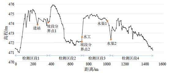 (2)檢測(cè)區(qū)段劃分。依據(jù)管道基本情況劃分檢測(cè)區(qū)段。分界點(diǎn)包括:①輸送介質(zhì)注入點(diǎn)、分輸點(diǎn);②緩蝕劑或化學(xué)藥劑加注點(diǎn);③經(jīng)過(guò)加溫或加壓站后,導(dǎo)致溫度和壓力等工藝參數(shù)發(fā)生變化的點(diǎn);④特殊地形地貌起止點(diǎn);⑤管道規(guī)格發(fā)生改變的點(diǎn)。該管道里程短、無(wú)支線、無(wú)藥劑加注、無(wú)變徑、無(wú)中間站,根據(jù)管道地形地貌數(shù)據(jù),確定水工、水渠、坡段起終點(diǎn)等特殊位置,將管道劃分為4個(gè)檢測(cè)區(qū)段,見(jiàn)圖 1。區(qū)段1(管道起點(diǎn)—坡段分界點(diǎn)1)包括明顯的上坡段、流體加速段,起伏密集。區(qū)段2(坡段分界點(diǎn)1—坡段分界點(diǎn)2)包括明顯的上坡段和顯著的下坡段,呈“V”字形變化段,是管道積水重點(diǎn)關(guān)注位置。區(qū)段3(坡段分界點(diǎn)2—水渠2)包括明顯的上坡段、下坡段及水渠等不易開(kāi)挖的建筑。區(qū)段4(水渠2—管道終點(diǎn))有連續(xù)下坡趨勢(shì),起伏密集多變。