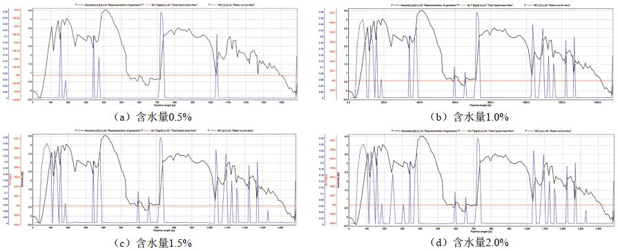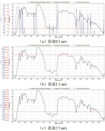 (1)不同輸量工況的模擬結(jié)果。首先以油品流速為變量,分別取流速0.5 m/s、1.0 m/s、1.5 m/s、2.0 m/s、2.5 m/s進(jìn)行五組仿真模擬,對(duì)應(yīng)質(zhì)量流速分別為165 kg/s、330 kg/s、494 kg/s、659 kg/s、823 kg/s。得到不同輸量下的管道沿程含水率分布圖(圖 3),圖中藍(lán)線代表管道沿程含水率,紅線代表管道輸量,黑線代表管道高程。