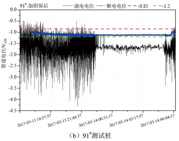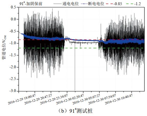采用數(shù)據(jù)記錄儀(uDL2型)對管道24 h通/斷電位進行檢測,參比電極為銅/硫酸銅,斷電試片暴露面積為6.5 cm2、材質(zhì)為L360。管道極化時間為1 h,通電周期設置為10 s,斷電周期1 s。