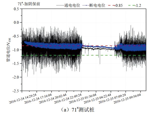 (3)通/斷電位波動幅度分析。71#測試樁14:29至20:02通電電位波動幅度為1.77 V(﹣2.00 VCSE~ ﹣0.23 VCSE),遠大于同時段斷電電位波動幅度0.33 V(﹣0.72 VCSE~﹣1.05 VCSE)。主要原因是受IR降波動影響。測試通電電位是管道和參比電極之間的管地電位,測試回路中存在土壤電阻率、部分涂層電阻率,當外界動態(tài)雜散電流I波動時,IR通隨之波動。測試斷電電位是斷電試片與參比電極之間的電位。雖然依舊存在動態(tài)雜散電流I,但是由于斷電試片離參比電極足夠近,且無涂層,R斷遠小于R通,則通電電位波動幅度遠大于斷電電位的。