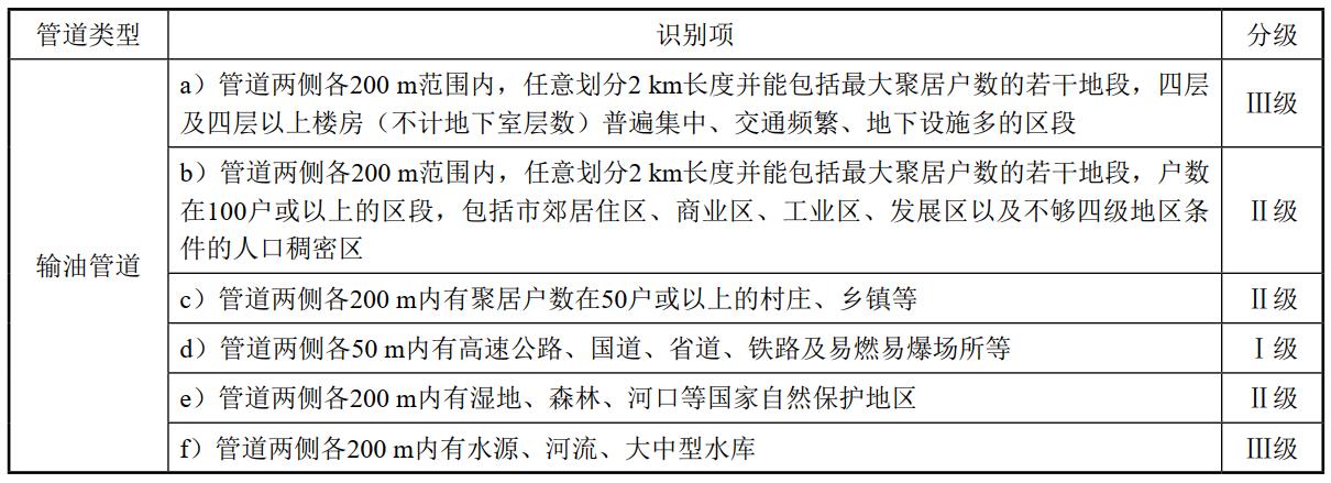 表 1 輸油管道高后果區(qū)管段識別分級表