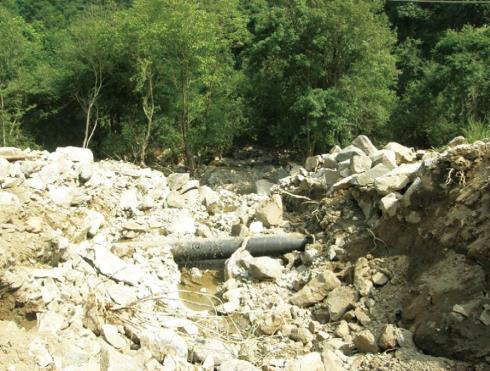 2010年7月,受連續(xù)大暴雨影響,關山溝泥石流爆發(fā),管道沿線水毀災害十分嚴重,許多地段公路邊溝破壞、護岸擋墻垮塌、過水路面不復存在,有600米管段多處受損。其中A穿越河流處,原采用護岸墻+圓管涵水工保護工程防護,管堤受板橋溝洪水垂直沖刷嚴重,洪水中夾帶有大量塊石造成管堤處原有圓管涵堵塞,塊石直接沖擊管道上方已形成寬約10米、深約5米的豁口,6米長露管,表面防腐層局部破損(圖 1)。