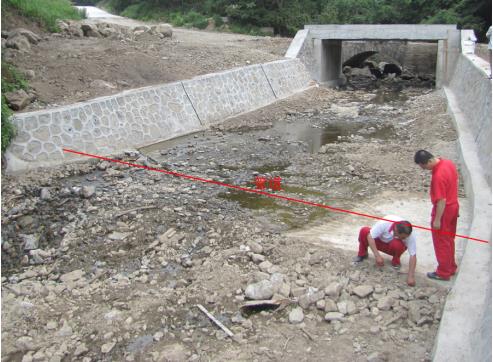 B穿越河流處,曾采用護岸墻+漿砌石過水路面形式防護,這次也因暴雨形成的水石流造成過水路面沖毀、左岸護岸墻前緣掏蝕嚴重及右岸護岸墻損毀殆盡(圖 3)。