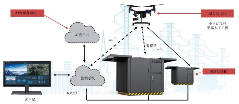 任務(wù)管理:在客戶端發(fā)布巡線任務(wù),無人機(jī)接收到4G信號指示后沿著設(shè)定的航線起飛、巡檢,到達(dá)50 km圖傳距離后進(jìn)入無人機(jī)停機(jī)坪充電,信號轉(zhuǎn)接。