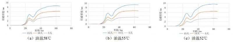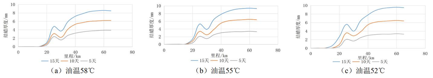 (1)不同出站油溫管道結(jié)蠟情況。分別選取高陽站出站油溫58℃、55℃和52℃,管道沿線地溫10℃,輸量100 m3/h,結(jié)合該管段每10天進行一次清管現(xiàn)狀,分別模擬計算管道運行5天、10天、15天的結(jié)蠟厚度。結(jié)果如圖 1所示。