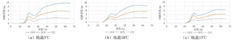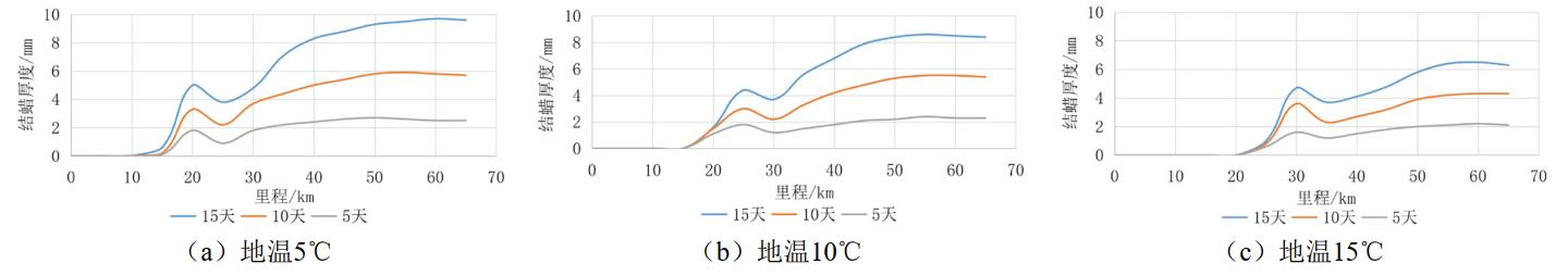 (2)不同沿線地溫管道結(jié)蠟情況。以高陽站出站油溫55℃,輸量100 m3/h,分別選取冬季管道沿線地溫為5 ℃、10 ℃、15 ℃,模擬計算管道運行5天、10天、15天的結(jié)蠟厚度,結(jié)果如圖 2所示。