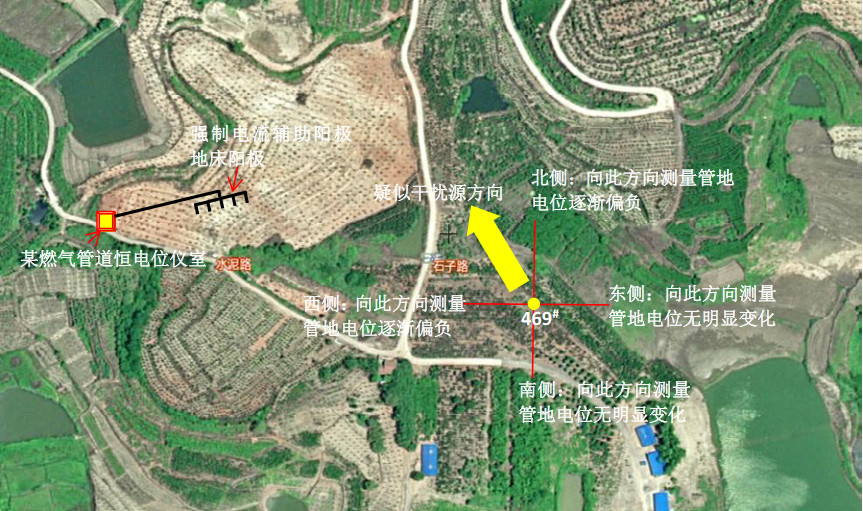 (3)確認(rèn)干擾源。對(duì)西北方向丘陵西側(cè)進(jìn)行排查,在道路旁發(fā)現(xiàn)一處密封小房屋,經(jīng)墻上電話聯(lián)系確認(rèn)為某燃?xì)夤艿缽?qiáng)制電流陰極保護(hù)站,輔助陽(yáng)極地床位于該小房屋東南側(cè)農(nóng)田中,與初步判斷的雜散電流干擾源方向相符。經(jīng)聯(lián)系該燃?xì)馄髽I(yè)停用陰極保護(hù)恒電位儀后,測(cè)試469#管地電位恢復(fù)正常;啟用該恒電位儀后,重新處于干擾狀態(tài)。反復(fù)啟停恒電位儀測(cè)試確認(rèn),該處強(qiáng)制電流陰極保護(hù)系統(tǒng)陽(yáng)極地床為原油管道469#測(cè)試樁靜態(tài)直流雜散電流干擾源。如圖 2所示。