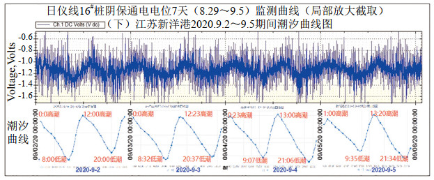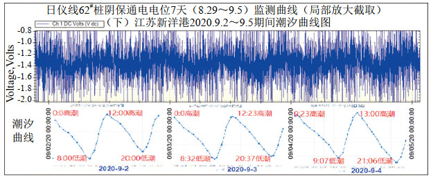 圖 5 日儀線管地電位監(jiān)測曲線與對應(yīng)時間段附近海域潮汐曲線對比圖