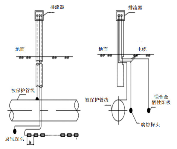 (2)在干擾嚴重、陰極保護不達標管段,采取負接地極(一般采用鎂合金犧牲陽極)+極性排流器組合方式進行排流防護(圖 6)。