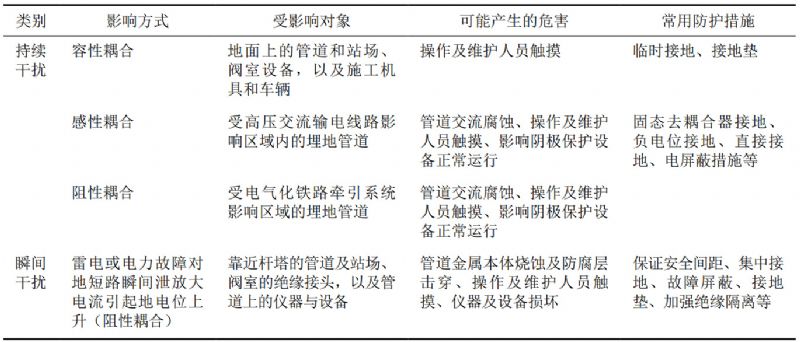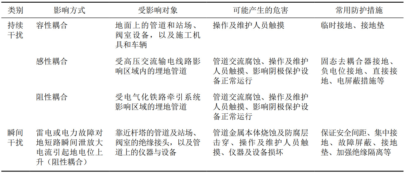 交流干擾源對埋地金屬管道的影響主要有兩方面:一是長期存在的感應(yīng)電壓對金屬管道造成干擾腐蝕;二是電力線路故障狀態(tài)下瞬態(tài)感應(yīng)電壓干擾,需采用干擾防護(hù)措施,詳情如表 1所示。