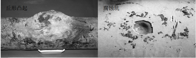 管道交流干擾腐蝕特征:在腐蝕坑上形成堅硬的腐蝕產(chǎn)物丘;腐蝕形態(tài)呈凹陷的半球狀;腐蝕坑比防腐層破損面積更大;腐蝕產(chǎn)物出現(xiàn)分層或含大量碳酸鈣,清除后金屬表面有明顯的的硬而黑的層狀痕跡,存在四氧化三鐵;腐蝕坑處pH值一般大于10。如圖 1所示。
