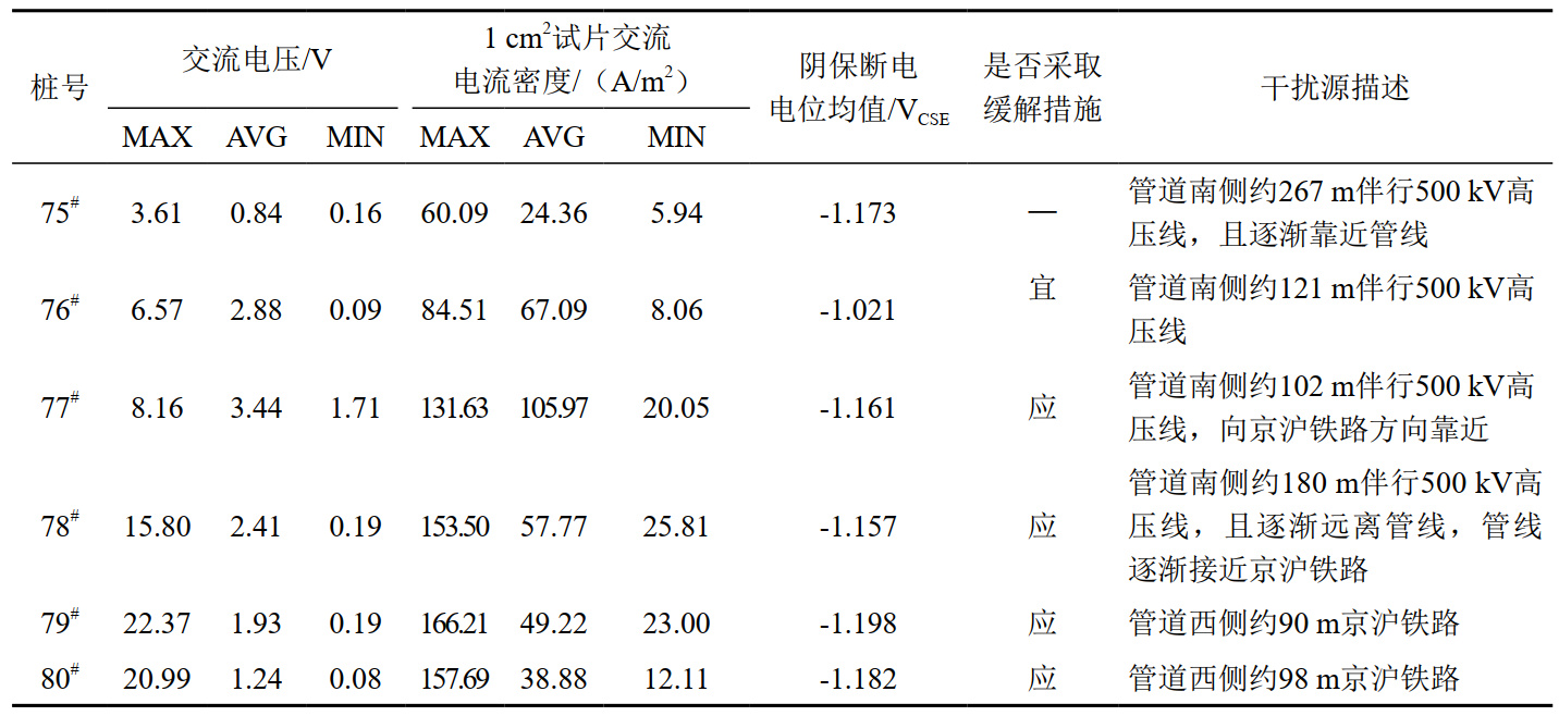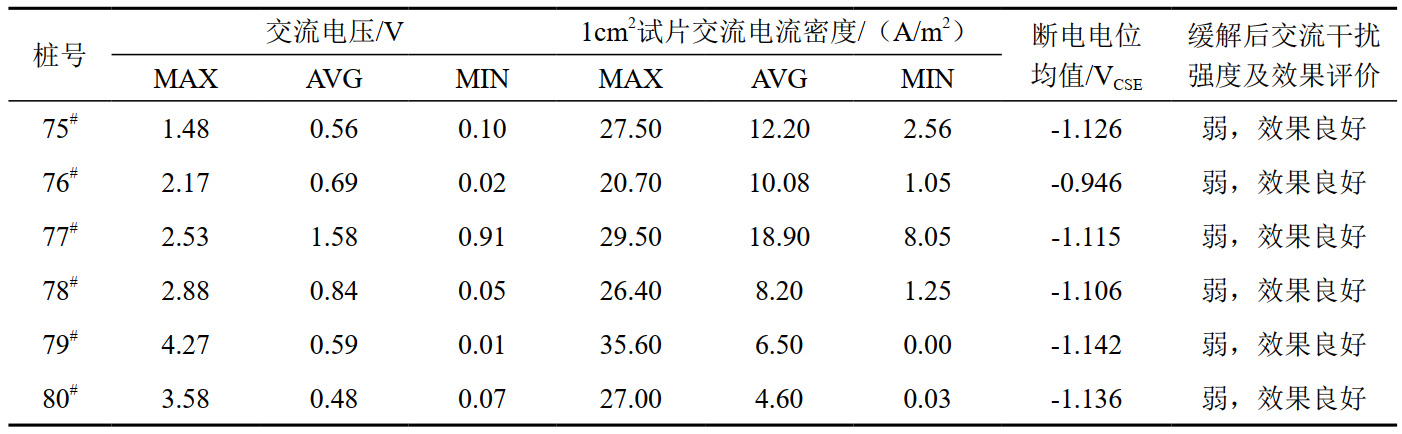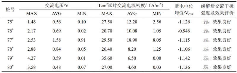 由表 2及圖 2可見,76#、78#、79#、80#監(jiān)測點交流干擾電流密度均值均超過30 A/㎡,77#監(jiān)測點超過100 A/㎡,根據(jù)GB/T 50698判定交流干擾程度分別為 “中”“強(qiáng)”。78#、79#、80#監(jiān)測點交流干擾電壓峰值超出NACE SP 0177―2007規(guī)定的15 V人體安全電壓限值,會威脅現(xiàn)場操作人員安全。該干擾管段陰極保護(hù)斷電電位普遍負(fù)于﹣1.15 VCSE,根據(jù)SY/T 0087.6中規(guī)定應(yīng)適當(dāng)減小鄰近陰保站恒電位儀輸出,使該管段陰保斷電電位處于合理區(qū)間。