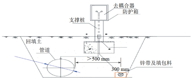 選用固態(tài)去耦合器+負(fù)極接地極兩種互補(bǔ)聯(lián)合排流方式,采用規(guī)格ZR-2帶狀鋅陽極作為接地體,根據(jù)現(xiàn)場土壤電阻率測試值,排流地床設(shè)置鋅帶100 m,與管道平行敷設(shè)(圖 5)。在76#~80#干擾嚴(yán)重管段沿線設(shè)置5處交流排流點,同時減小干擾管段上下游陰保站恒電位儀輸出,使該管段陰保斷電電位處于合理區(qū)間。排流檢測結(jié)果如表 3所示。