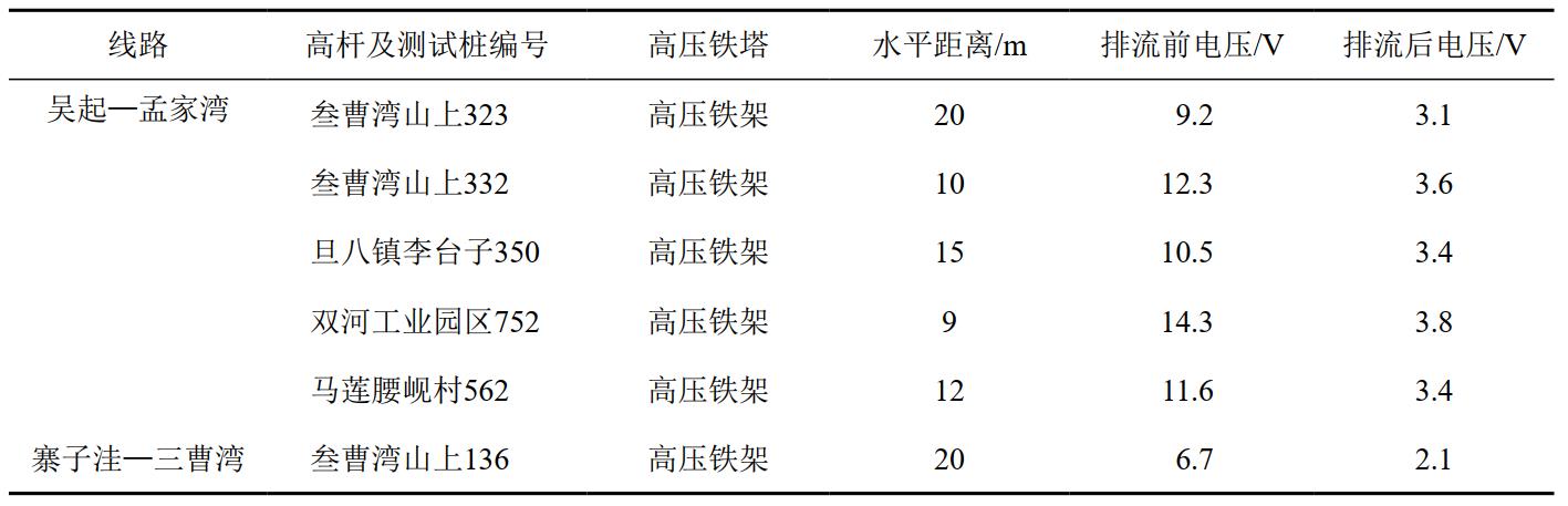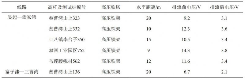 (2)高壓輸電線路及高鐵的近距離影響。隨著陜北地區(qū)經(jīng)濟(jì)發(fā)展,750 kV以上的輸電線路及鐵路電氣化改造多個項目實施,與原有輸油管道形成多處交叉及近距離的并行敷設(shè)。即使嚴(yán)格按照GB 50253―2014《輸油管道工程設(shè)計規(guī)范》中4.1.6的要求控制間距,實踐中發(fā)現(xiàn)由高壓輸電線路以及高鐵運(yùn)營所引發(fā)的雜散電流對輸油管道的干擾并不能完全消除。例如,吳延線路6處管段在水平距離大于高壓電塔塔高、無排流措施的情況時交流干擾電壓在4 V~15 V之間,安裝固態(tài)去耦合器加接地的排流措施后交流干擾電壓才降至小于4 V(表 1)。