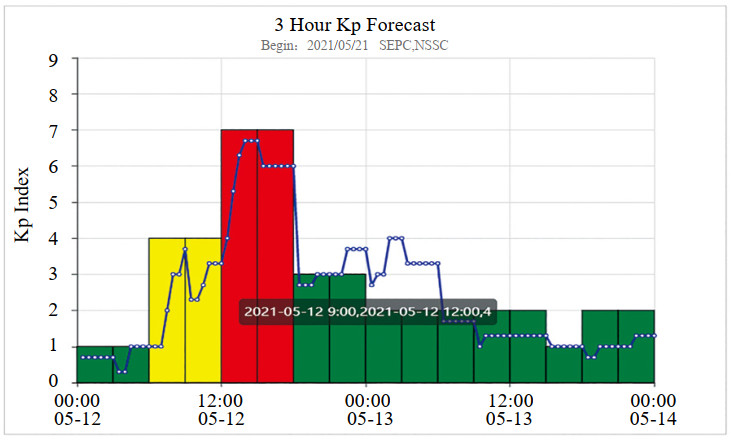 2021年5月,通過對(duì)某管線上智能電位測試樁監(jiān)測數(shù)據(jù)分析,發(fā)現(xiàn)沿線智能電位測試樁通電電位和斷電電位均存在持續(xù)不規(guī)則波動(dòng),波動(dòng)趨勢一致,但均未呈現(xiàn)出明顯的隨時(shí)間變化的周期性特點(diǎn),也無明顯的靜息期,如圖 3所示。經(jīng)查詢空間環(huán)境預(yù)報(bào)中心網(wǎng)站(圖 4),5月12日12:00—18:00這段時(shí)間內(nèi)發(fā)生Kp=7的大地磁暴事件,因此該時(shí)段內(nèi)管道受到的地磁干擾相較于其他時(shí)間明顯增強(qiáng),表現(xiàn)為通電電位波動(dòng)幅度顯著增大,且斷電電位波動(dòng)幅度也有所增大。