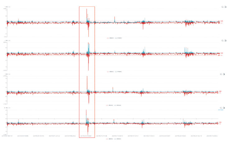 (2)地磁干擾對(duì)大地中所有的埋地金屬結(jié)構(gòu)物都會(huì)產(chǎn)生影響,因此,不僅受干擾管道全線都會(huì)受到影響,而且分布在不同地理位置的管道也同時(shí)受到影響,這一點(diǎn)在發(fā)生強(qiáng)地磁暴時(shí)表現(xiàn)尤為明顯。發(fā)生強(qiáng)地磁暴時(shí),分布在不同地理位置的管道電位波動(dòng)同時(shí)同步增加;可以利用這一點(diǎn)來明確管道電位的無規(guī)則波動(dòng)是地磁干擾所致。