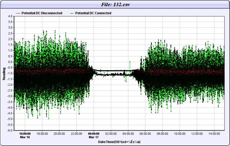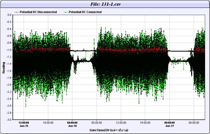 排流施工結(jié)束后,依舊采用UDL-2對管道長時間通/斷電位進行監(jiān)測,以此判斷排流地床有效性有了明顯改善(圖 3)。安裝排流地床后,3處測試樁斷電電位曲線明顯下移,電位正于﹣850 mV的電位占比低于5%,說明排流地床設(shè)計、施工達到預(yù)計要求。