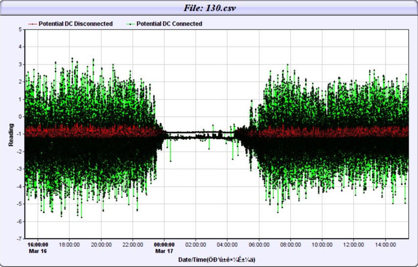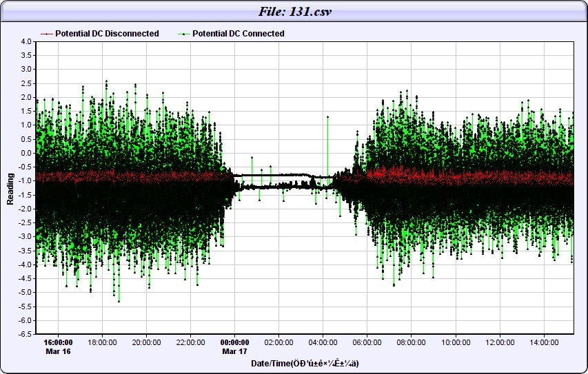 測試同時表明,130#樁波動范圍﹣5.74 V至﹢3.11 V、131#樁波動范圍﹣5.42 V至﹢2.644 V、132#樁波動范圍﹣4.87 V至﹢2.371 V。其中130樁波動最劇烈,波動幅度為8.85 V,131#樁次之,132#樁相對波動最小,離干擾源越近干擾程度越大。