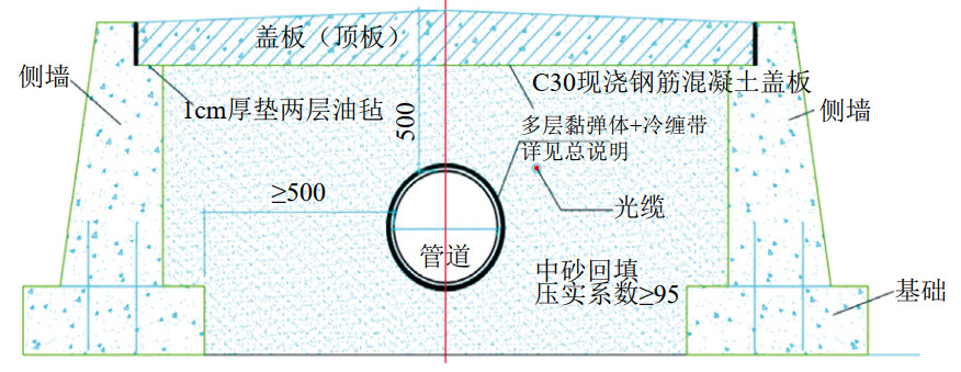 (3)提升了管道安全性。相較傳統(tǒng)蓋板涵,增加了側(cè)墻與管道凈間距,一方面減小側(cè)墻開挖、澆筑等作業(yè)過程中管道意外損傷的風(fēng)險,另一方面減小了道路運營過程中交變載荷對管道的影響,提升了管道及其附屬設(shè)施的安全性[7]。