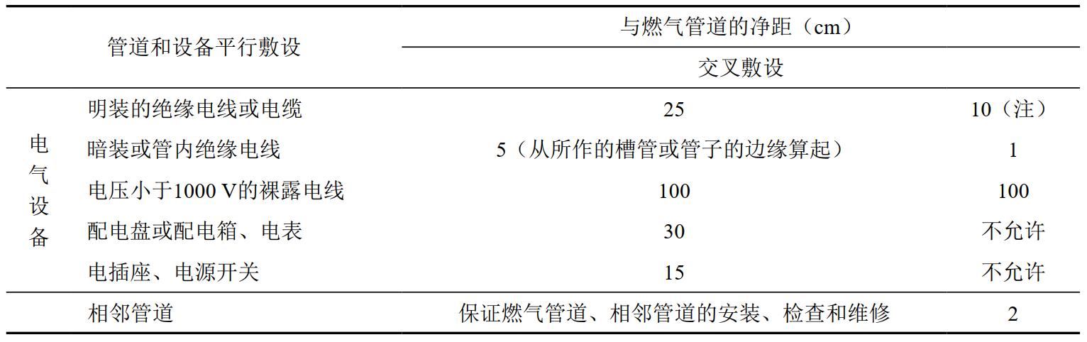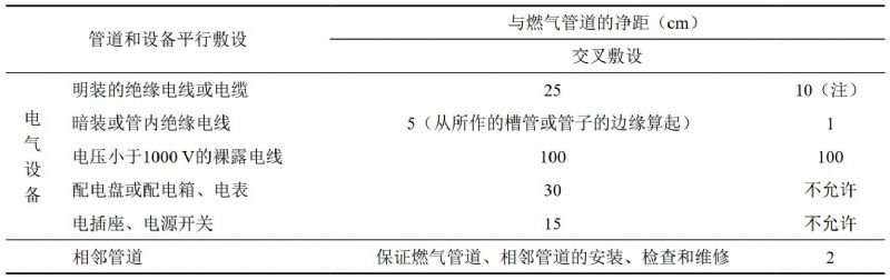 表 1 室內(nèi)燃?xì)夤艿琅c電氣設(shè)備、相鄰管道、設(shè)備之間的最小凈距