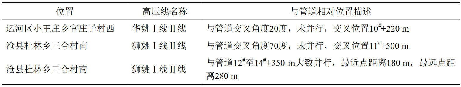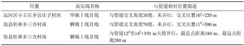 現(xiàn)場踏勘11#和12#附近發(fā)現(xiàn)3條22 kV高壓輸電線路,與管道相對位置見表 1。距管道1.6 km處為滄州華潤發(fā)電廠,與管道相對位置見圖 1。